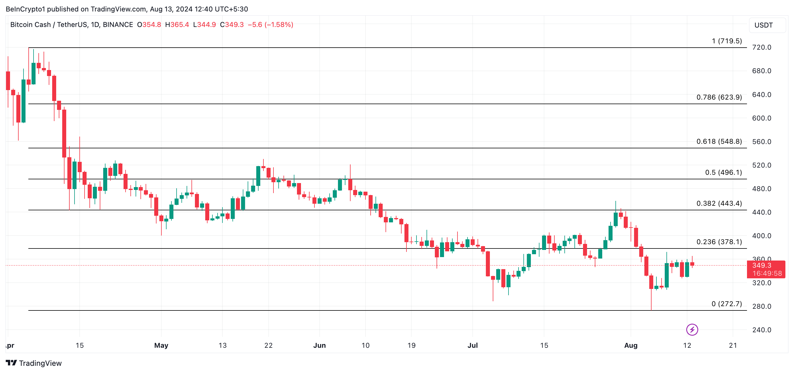 Vid presstillfället handlas BCH för $349,68, och priset har hållit sig inom ett smalt intervall under de senaste sju dagarna.