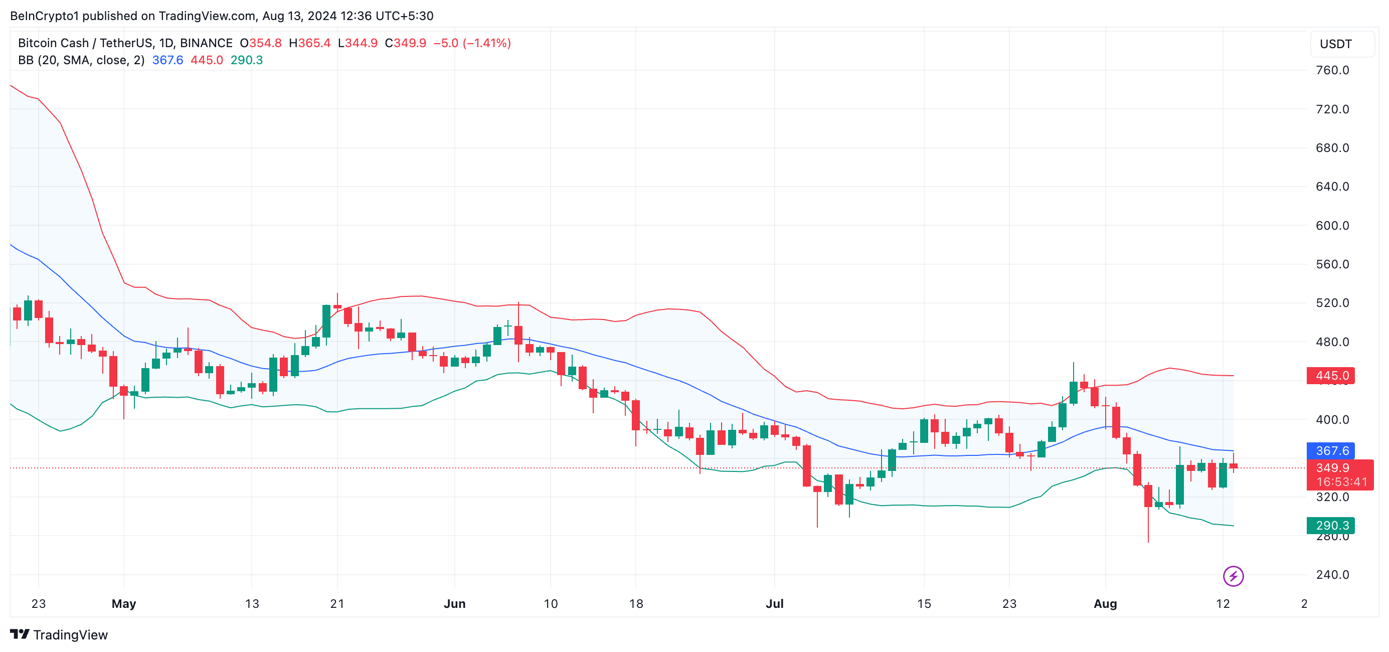 När gapet mellan dessa band ökar tyder det på att marknadsvolatiliteten har ökat. Detta inträffar vanligtvis efter en betydande prisrörelse i båda riktningarna. I BCH:s fall började gapet vidgas efter att den allmänna marknadsnedgången den 5 augusti fick altcoinets pris att sjunka till den lägsta nivån på sju månader på 309,90 dollar.