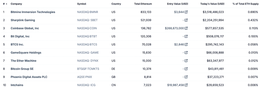 Ethereum-treasuryföretag som Tom Lees Bitmine Immersion Technologies (NASDAQ: BMNR), det #1 börsnoterade ETH-innehavande företaget med 833 133 ETH värt 3,5 miljarder USD vid pressens tidpunkt, driver denna uppskattning.