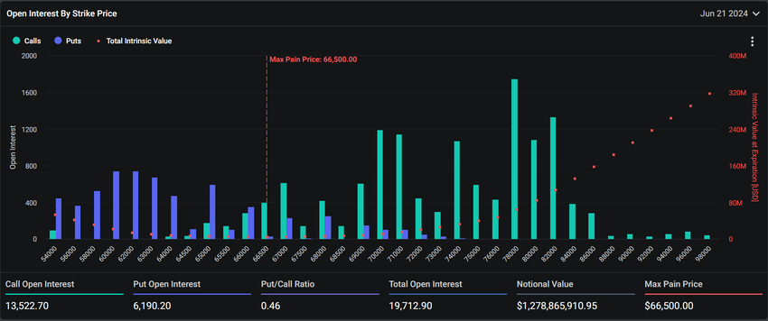 Dagens utgående Bitcoin-optioner har ett nominellt värde på 1,27 miljarder dollar. Dessa 19 712 utgående kontrakt har ett put-to-call-förhållande på 0,46 och en maximal smärtpunkt på $66 500.