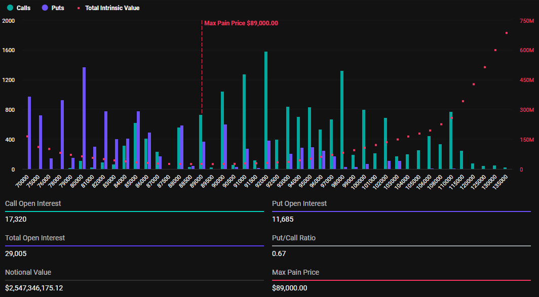 Idag, den 7 mars, löper 29 005 Bitcoin-kontrakt med ett nominellt värde av 2,54 miljarder USD ut. Enligt Deribit-data är Bitcoins put-to-call-förhållande 0,67. Smärtgränsen—priset där tillgången orsakar störst ekonomisk förlust för flest innehavare—är 89 000 USD.