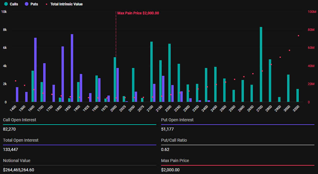 Ethereum har 264,46 miljoner USD i optioner som löper ut, med 133 447 kontrakt. Detta är också lägre än föregående veckas 223 395 kontrakt. Smärtgränsen för dessa optioner är 2 000 USD, och put-to-call-förhållandet är 0,62.