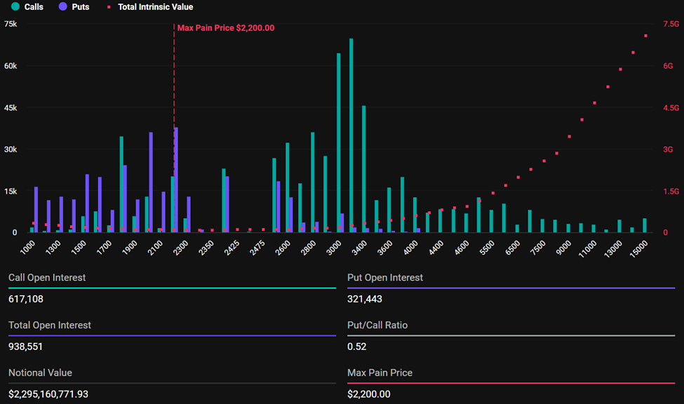 Den positiva utsikten sträcker sig till Ethereum, som har ett maxsmärtpris på 2 200 USD och ett put-to-call-förhållande på 0,52, vilket tyder på optimism på marknaden.