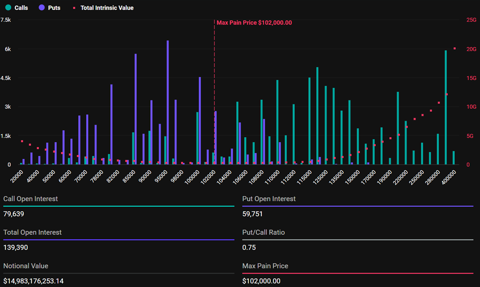 För de utgående Bitcoin-optionerna är maxsmärtpriset 102 000 USD, och put-to-call-förhållandet är 0,75. Detta tyder på att handlare köper fler köpoptioner än säljoptioner.