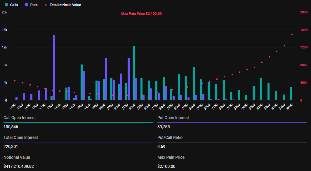Samtidigt kommer 220 301 Ethereum-optioner att löpa ut idag, ner från 223 395 förra veckan. Med en put-to-call-kvot på 0,69 och en max smärtpunktsnivå på 2 100 USD kan utgångarna påverka ETH:s kortsiktiga prisrörelse.