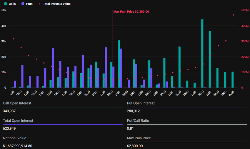Jämfört med detta har deras Ethereum-motsvarigheter ett maximalt smärtpris på 2 300 USD och en put-to-call-kvot på 0,81, vilket speglar en liknande marknadssyn. Ethereums utgående optioner uppgår till 623 949 kontrakt, upp från 25 438 kontrakt föregående vecka.