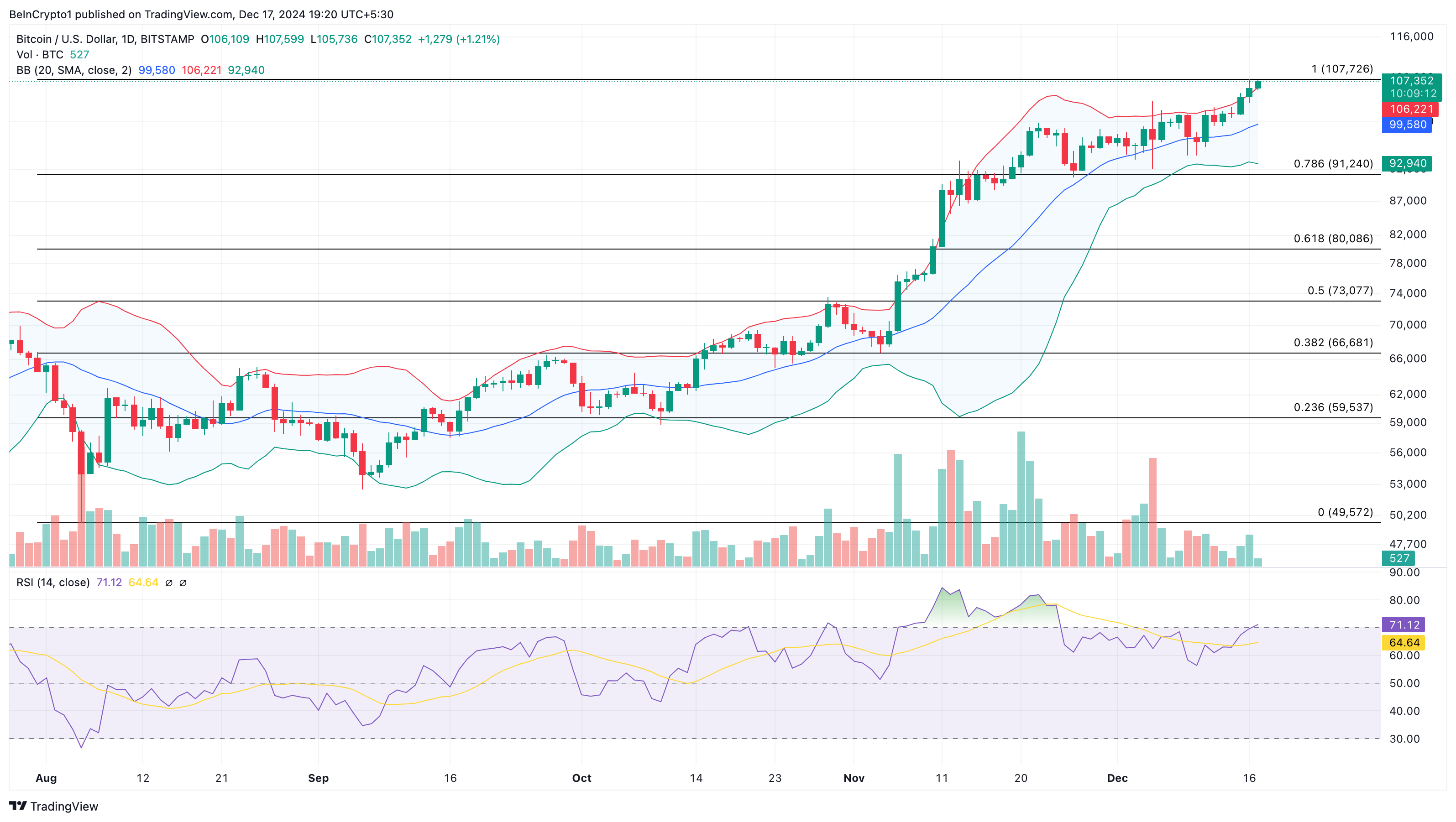 På det dagliga diagrammet har Bollinger Bands (BB), som mäter volatilitet, nått Bitcoins pris vid 107 352 USD. BB visar nivån av volatilitet och om en tillgång är överköpt eller översåld.