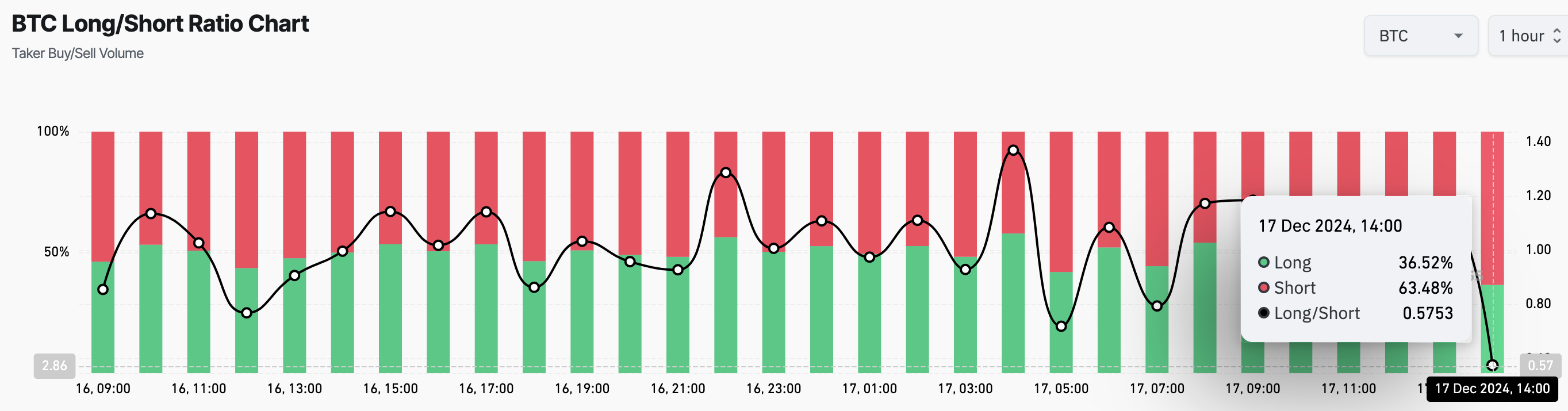 Data från Coinglass visar att Bitcoins lång/kort-kvot har sjunkit till 0,58, med korta positioner som står för 63,48 % av det totala öppna intresset, medan långa positioner utgör endast 36,52 %. Denna skillnad förstärker uppfattningen att de flesta handlare förbereder sig för en kortsiktig korrigering av Bitcoins pris.