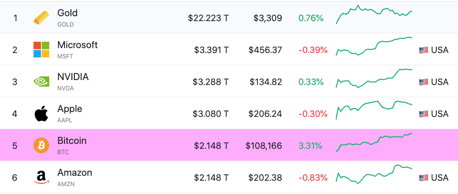 “Bitcoin går om Google och är nu den 6:e största tillgången i världen, och passerar Alphabet (Google) med ett marknadsvärde på över 2 biljoner USD. BTC ligger nu bara efter guld, Microsoft, Nvidia, Apple och Amazon. Detta är inte bara en siffra—det är historia som skapas,” skrev Bitward Investment medgrundare och COO Dariusz Kowalczyk.
