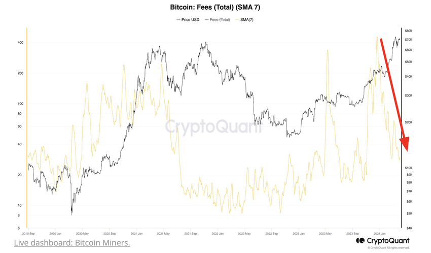 Dessutom har transaktionsavgifterna för Bitcoin minskat dramatiskt. De sjönk från 412 Bitcoin per dag i mitten av december 2023 till bara 29 Bitcoin, vilket innebär en minskning med 90 %. För närvarande bidrar transaktionsavgifter bara med 3% till den totala blockbelöningen, betydligt lägre än 37% i mitten av december 2023.