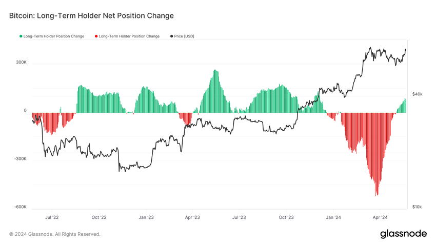 Bitcoins långvariga innehavares nettopositionsförändring ger en inblick i detta beteende. Efter att ha genomgått en långvarig distributionsperiod har långsiktiga innehavare börjat ackumuleras igen och har samlat mer än 70,000 BTC sedan början av maj.
