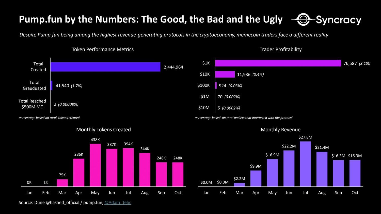 Data visar att endast 2 av 2,44 miljoner skapade tokens på denna plattform nådde en marknadsvärdering på 500 miljoner USD. Endast 3,1 % av plånböckerna uppnådde en vinst på 1 000 USD, med ännu lägre siffror för högre vinsttrösklar. Trots dessa statistik fortsätter plattformen att lansera över 248 000 tokens varje månad, vilket genererar över 16,3 miljoner USD i månadsintäkter.
