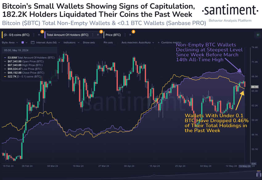 Dessutom indikerar Santiment-data att Bitcoin-plånböcker som innehar mindre än 0.1 BTC har minskat sina totala innehav med 0.46% under den senaste veckan.