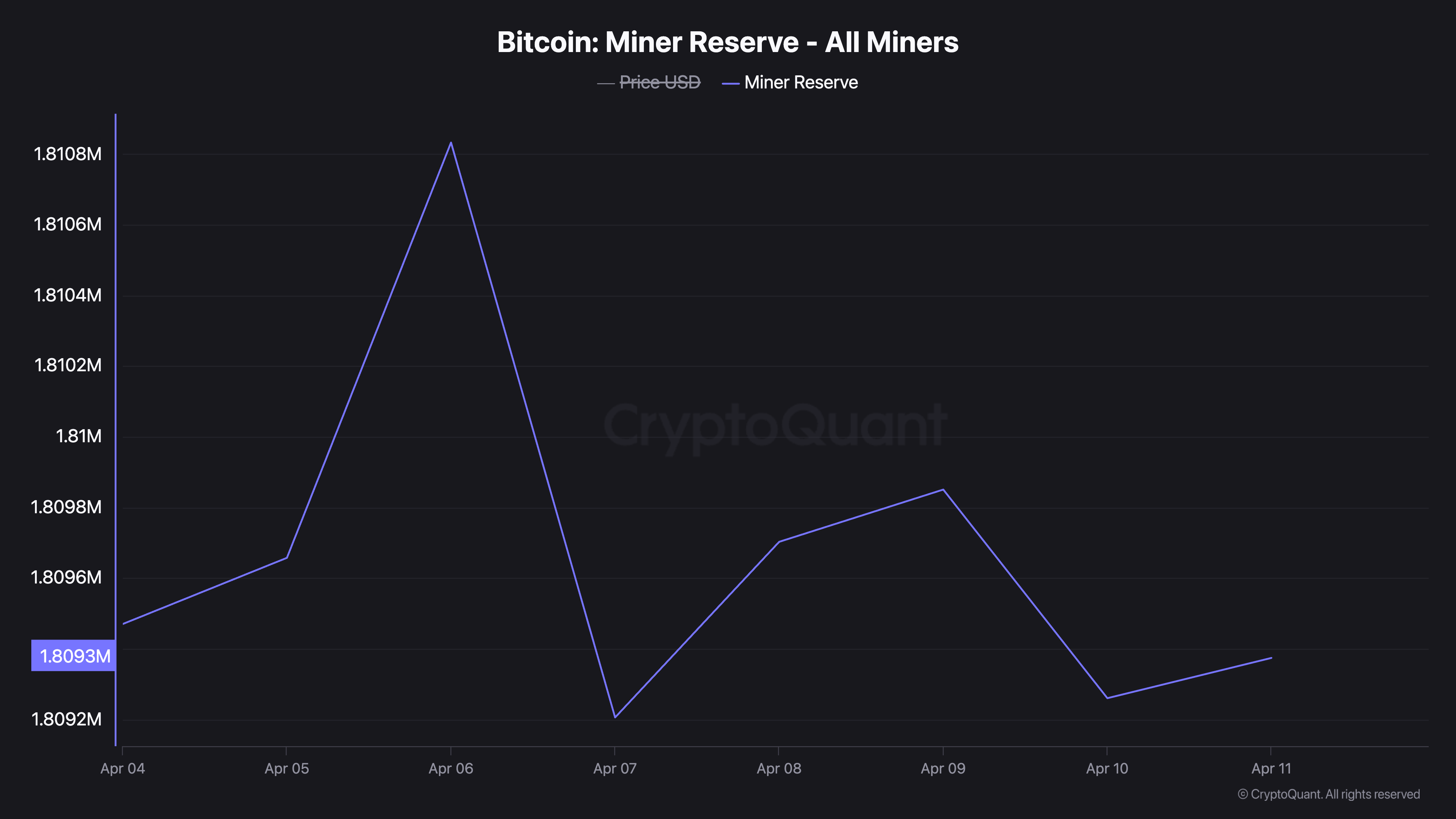 Enligt CryptoQuants data har BTC-gruvarbetarnas reserv minskat stadigt denna vecka. I skrivande stund är den 1,80 miljoner BTC, en minskning med 1 % från föregående vecka.