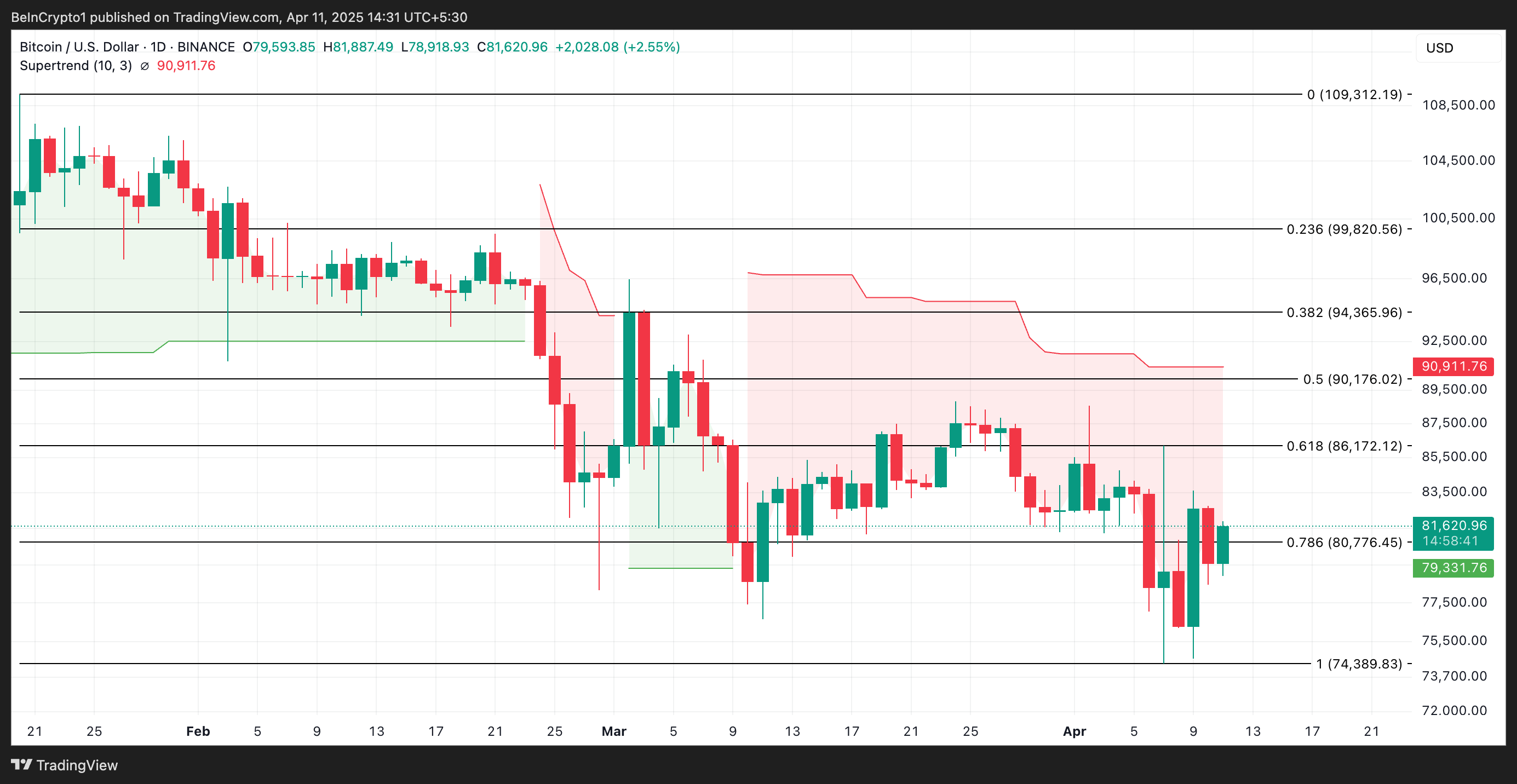 På det dagliga diagrammet ligger BTC betydligt under sin Super Trend-indikator, som bildar dynamiskt motstånd ovanför dess pris vid 90 911 USD.