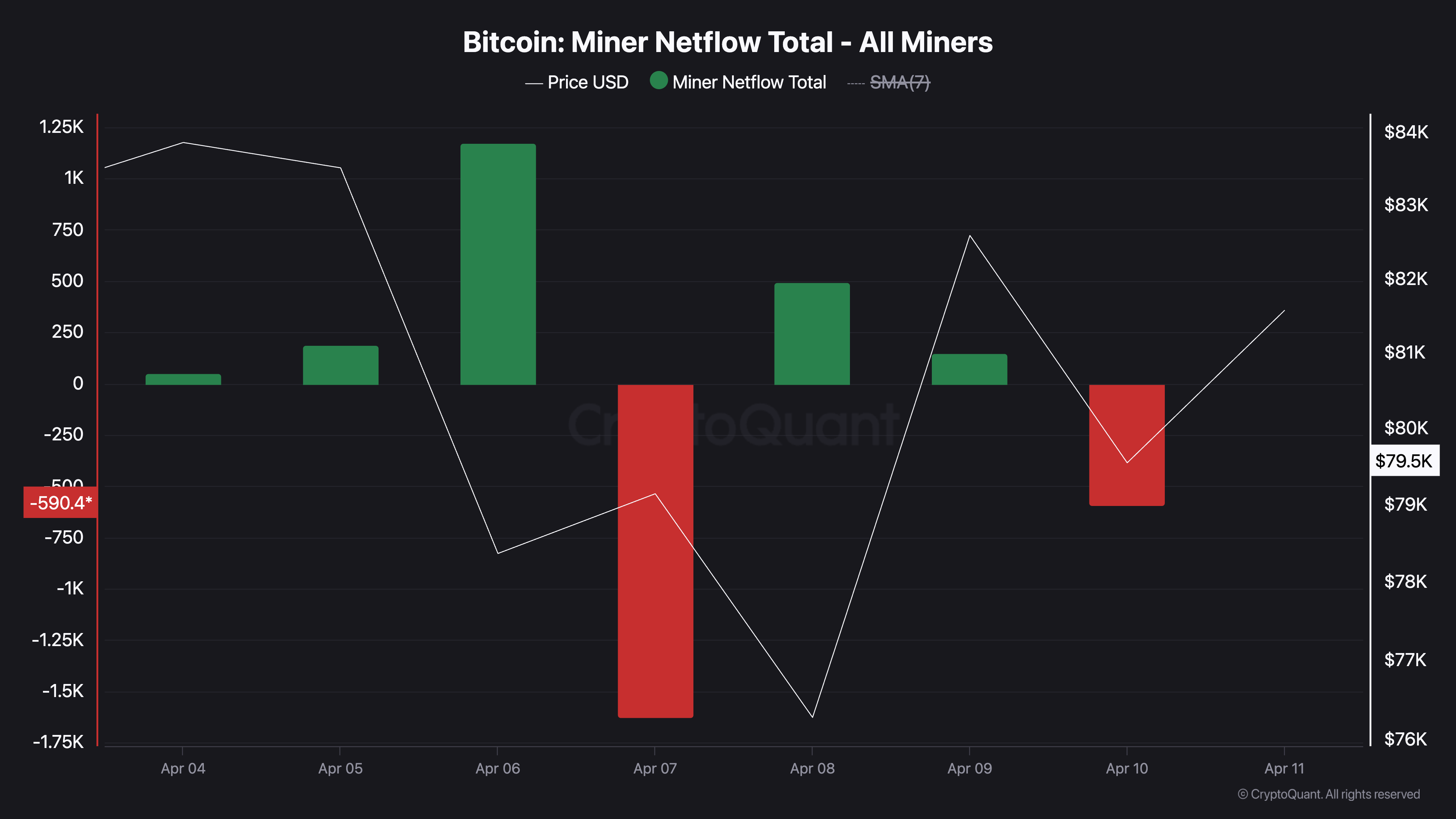 Myntets negativa gruvarbetarnettflöde bekräftar denna trend. Den 10 april var det -590,40. BTC:s gruvarbetarnettflöde spårar skillnaden mellan antalet mynt som skickas till börser och vad som tas ut.