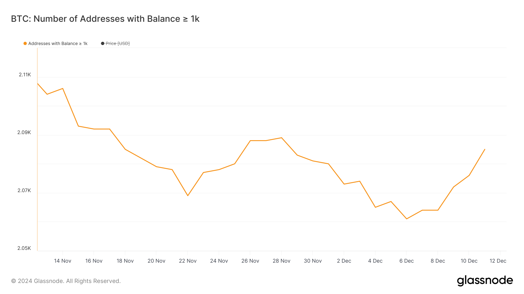 Sedan den 6 december har denna trend vänt, med antalet valadresser som klättrar tillbaka till 2 085. Denna återhämtning antyder förnyad ackumulering och signalerar växande förtroende bland stora BTC-innehavare. Även om detta är ett positivt tecken, är det viktigt att notera att den nuvarande siffran fortfarande ligger efter nivåerna som sågs i mitten av november.