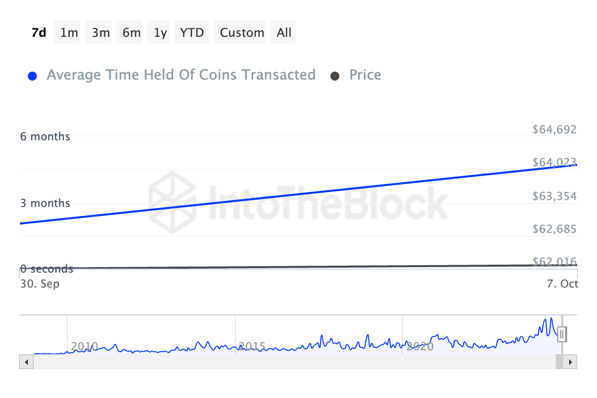 Dessutom har BTC:s hålltid ökat med 301 % under den senaste veckan, vilket bekräftar att mynten hålls längre innan de handlas. Detta är en positiv signal som visar handlarnas vilja att behålla sina mynt under längre perioder.