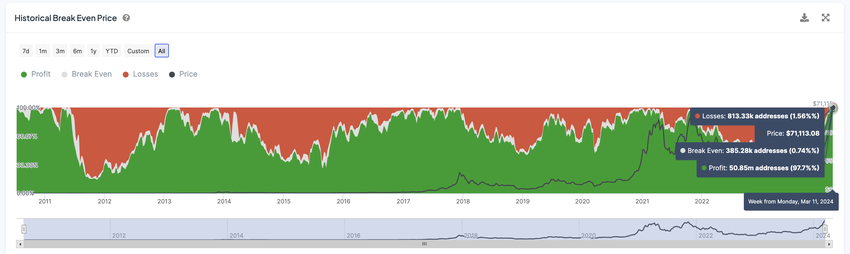 På grund av BTC: s senaste ökning, som konsekvent sätter nya heltidshöjder, har andelen innehavare som åtnjuter vinster närmat sig nästan 100%. Denna nivå av utbredd lönsamhet bland BTC-investerare har inte observerats sedan november 2021, då mätvärdet steg till 93.8%.