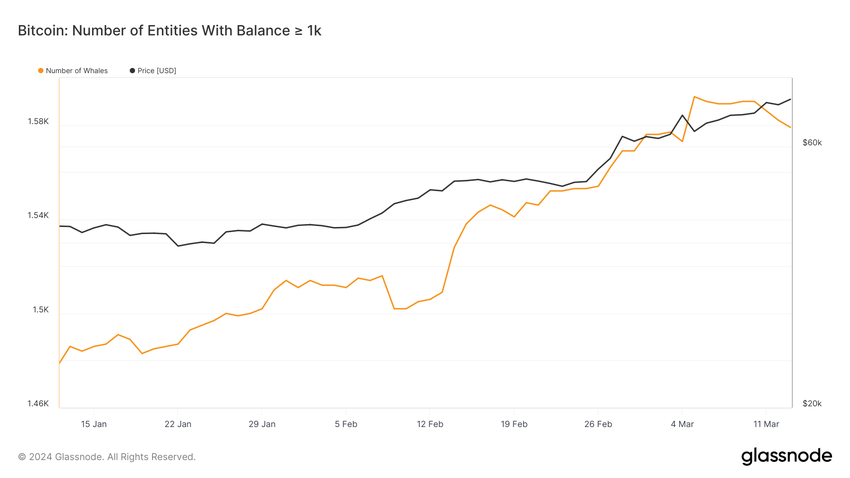Antalet Bitcoin-adresser som innehar minst 1,000 XNUMX BTC har stadigt klättrat från 1,486 13 januari till 1,592 5 mars. Ändå observerades en liten nedgång från 5 mars till 13 mars, där summan sjönk till 1,579 adresser.
