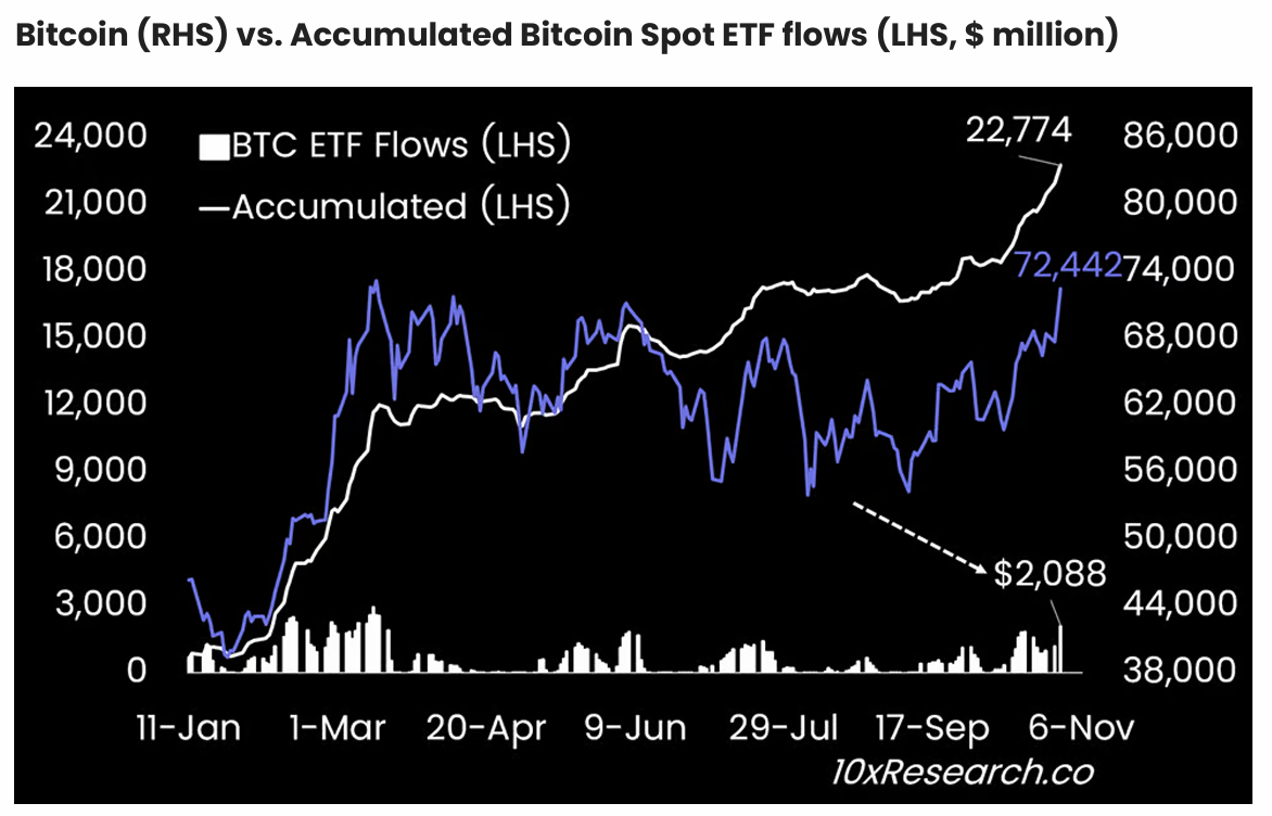 En rapport från 10x Research visar att över 4,1 miljarder USD i ETF-inflöden har registrerats i oktober ensamt, vilket är den högsta volymen för en enskild månad sedan mars.