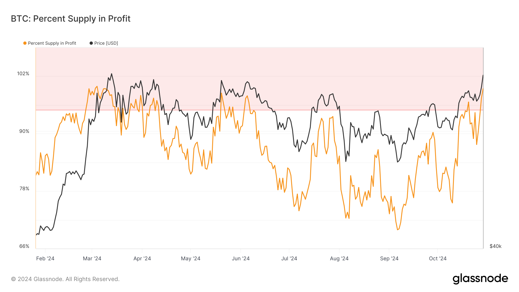 Bitcoins makromomentum tyder dock på försiktighet, eftersom den totala tillgången i vinst indikerar en potentiell marknadstopp. Historiskt sett bildas en marknadstopp när över 95 % av Bitcoins tillgång är lönsam, vilket signalerar överköpta förhållanden. För närvarande är cirka 99,4 % av Bitcoins tillgång i vinst, vilket återspeglar sannolikheten för en marknadstopp. Detta scenario tyder på att Bitcoins rally kan möta motstånd, eftersom så höga vinstnivåer ofta leder till ökat säljtryck.