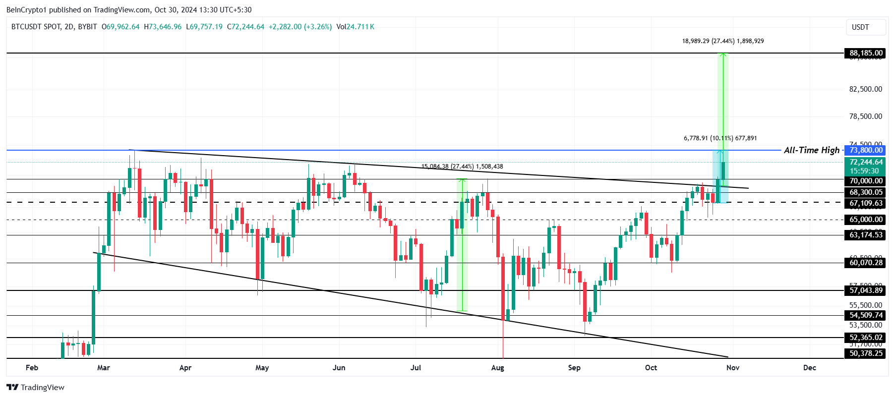 Bitcoins pris närmar sig en avgörande punkt och ligger mindre än 2 % från det tidigare rekordhöga värdet på 73 800 USD. Denna pågående uppgång signalerar ett utbrott från det nedåtgående kilformade mönstret, vilket traditionellt förutspår en stark rally.