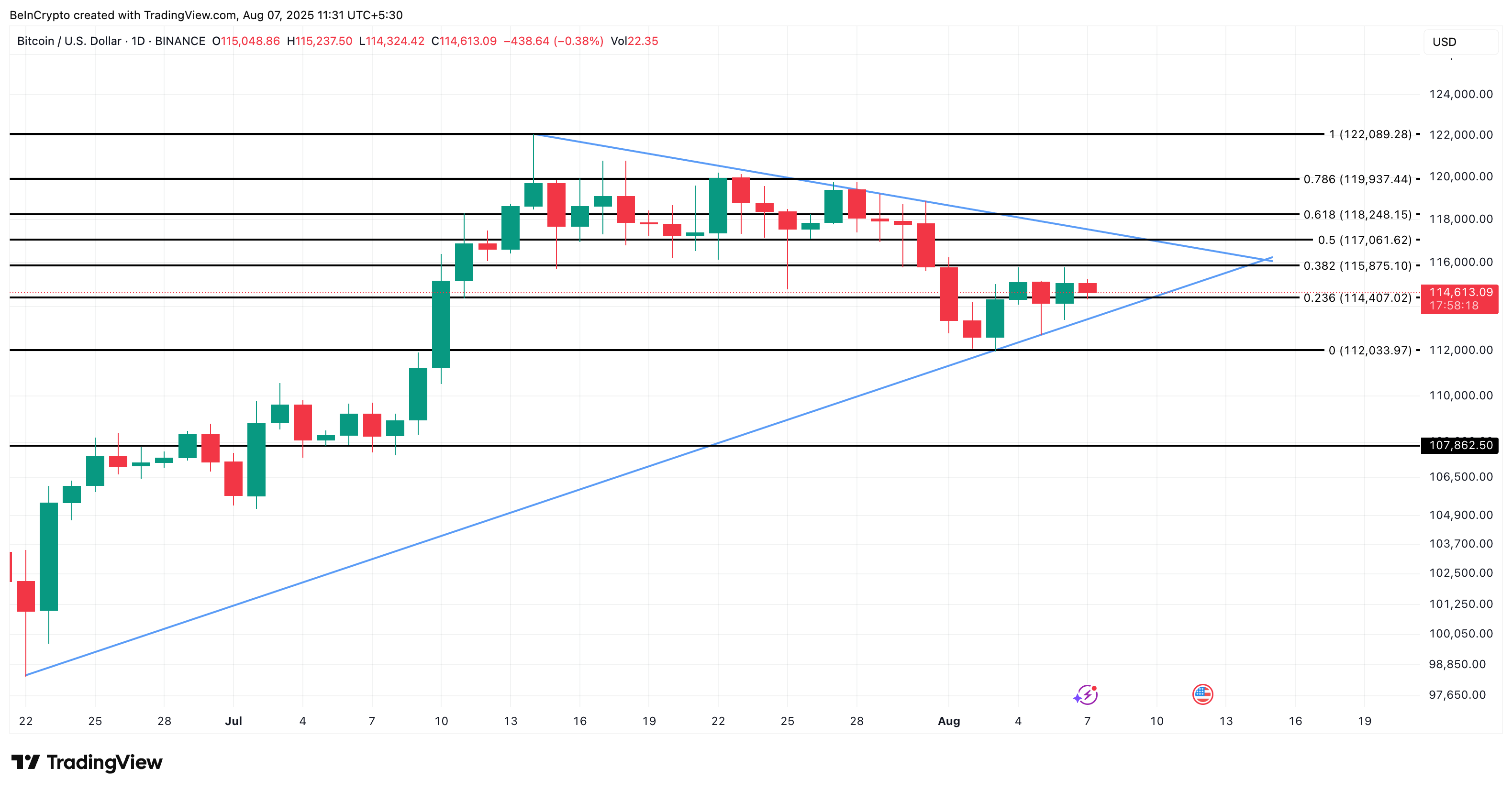 Kombinera detta med det faktiska diagrammönstret. Bitcoin rör sig inom ett positivt vimpelmönster. Nyckelmotståndet förblir 115 000 USD. Det är linjen Bitcoin bara inte kan bryta. Men priset har gjort högre bottnar medan det konsoliderar under den nivån.
