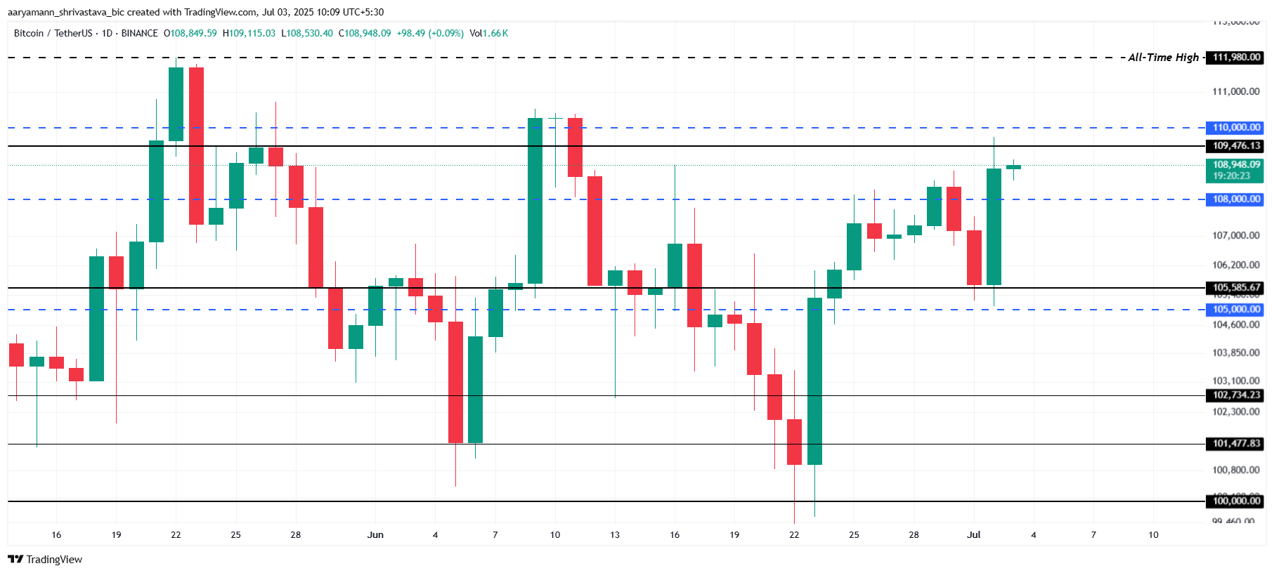 • Nyckelmotståndet vid 109 476 USD kvarstår, med ett tydligt genombrott som leder Bitcoin att testa 110 000 USD och potentiellt högre nivåer.