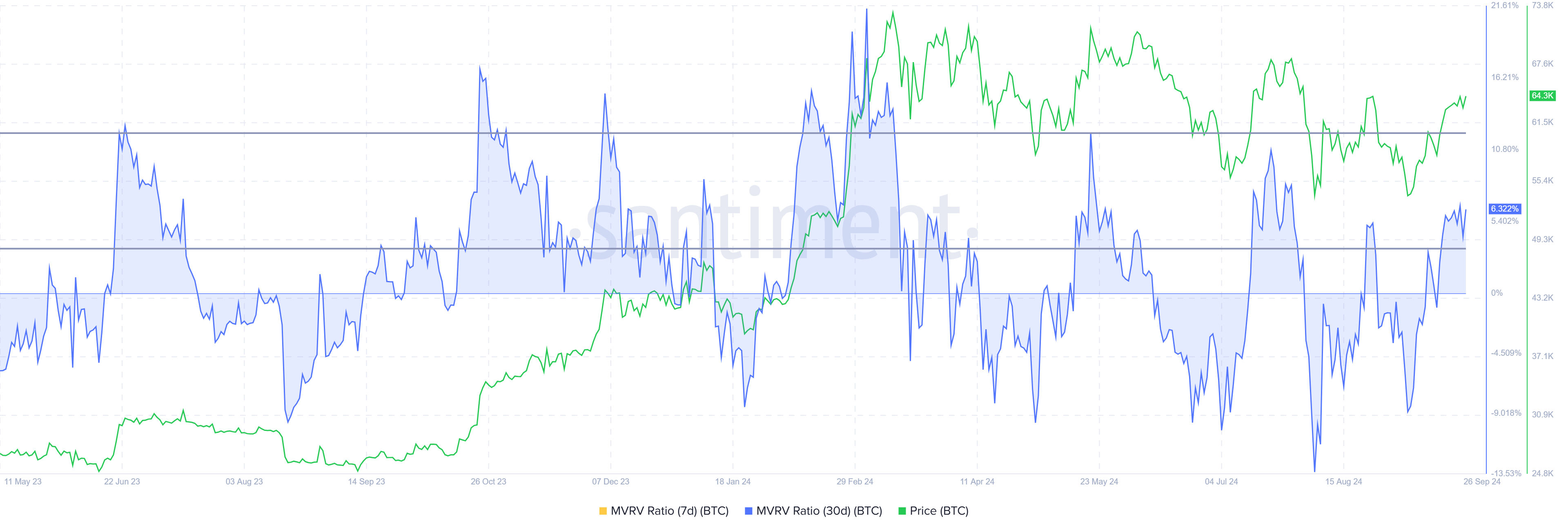 En viktig indikator på lönsamhet, detta mått har återgått till farozonen efter nästan en månad. Bitcoins 30-dagars MVRV ligger nu på 6,3%, vilket signalerar att investerare har vinst.