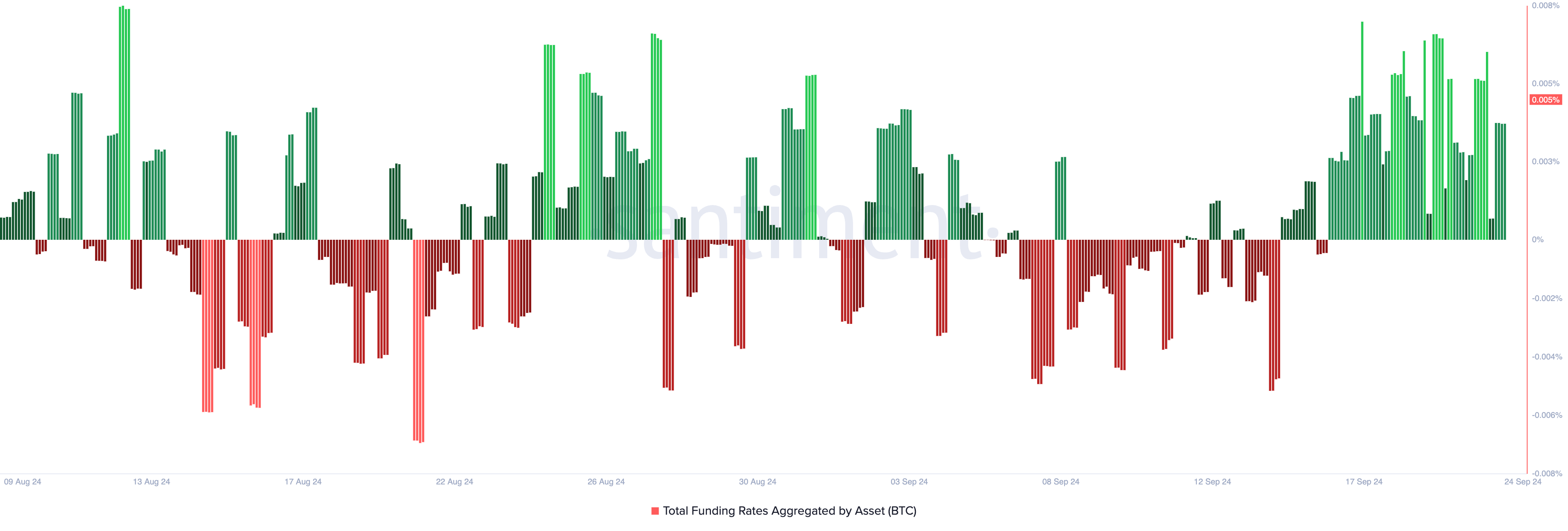 Bitcoins positiva finansieringsgrad sedan den 15 september är ytterligare en hausseartad indikator som tyder på att dess pris kan fortsätta att rally. Vid tidpunkten för publiceringen är myntets finansieringsgrad, som representerar en periodisk avgift som betalas för att säkerställa att dess kontraktspris ligger nära dess spotpris, 0,005%.