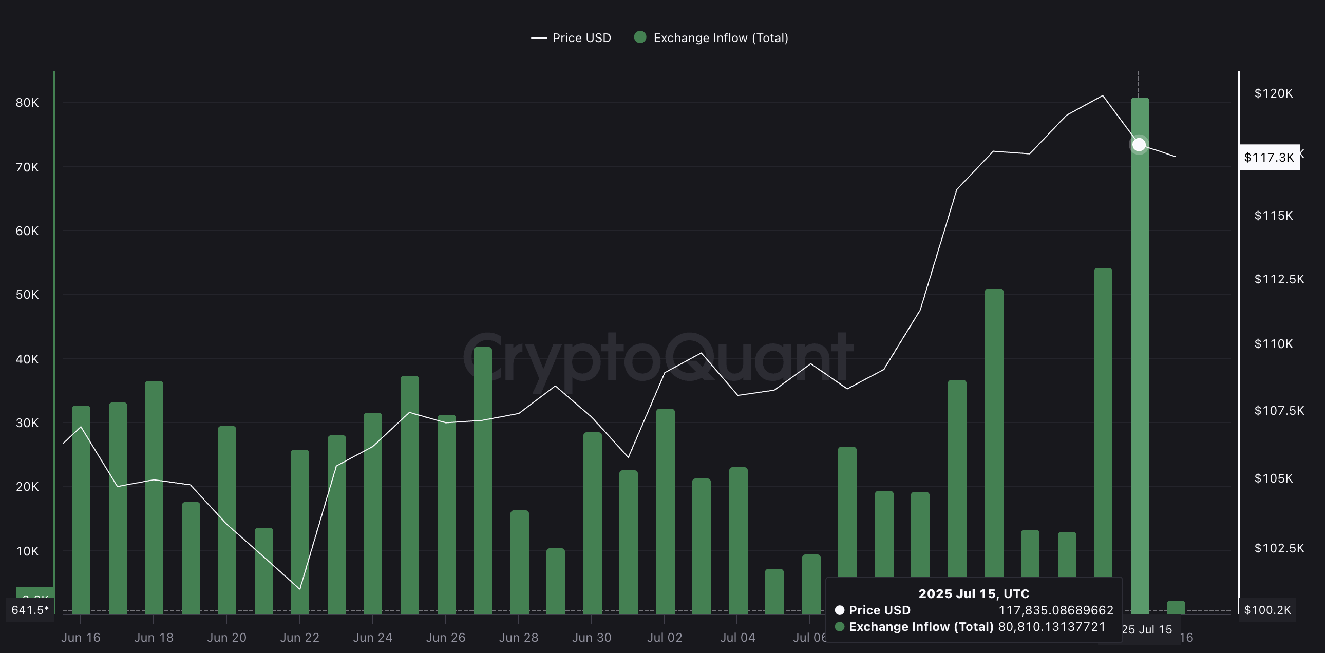 Data från CryptoQuant visar att den 15 juli flyttades över 80 810 BTC till centraliserade börser: det största inflödet på en dag på flera dagar. Detta motsvarar mer än 9,4 miljarder USD i Bitcoin som går in på plattformar.