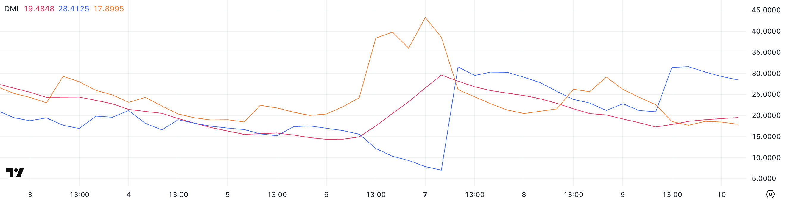 Ser man djupare på komponenterna, är +DI (Positive Directional Indicator) för närvarande på 28,41, ett kraftigt hopp från 20,84 bara igår efter Trumps 90-dagars tulluppskov, exklusive Kina.