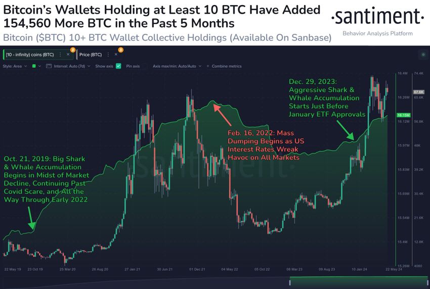 Santiments analys på kedjan stöder ytterligare denna trend och visar att Bitcoin-plånböcker som innehåller minst 10 BTC har ökat sina innehav med 154 560 BTC under de senaste fem månaderna. Detta mönster av ackumulering bland större plånboksinnehavare är en kritisk indikator på marknadssentiment, vanligtvis förknippad med haussefaser.