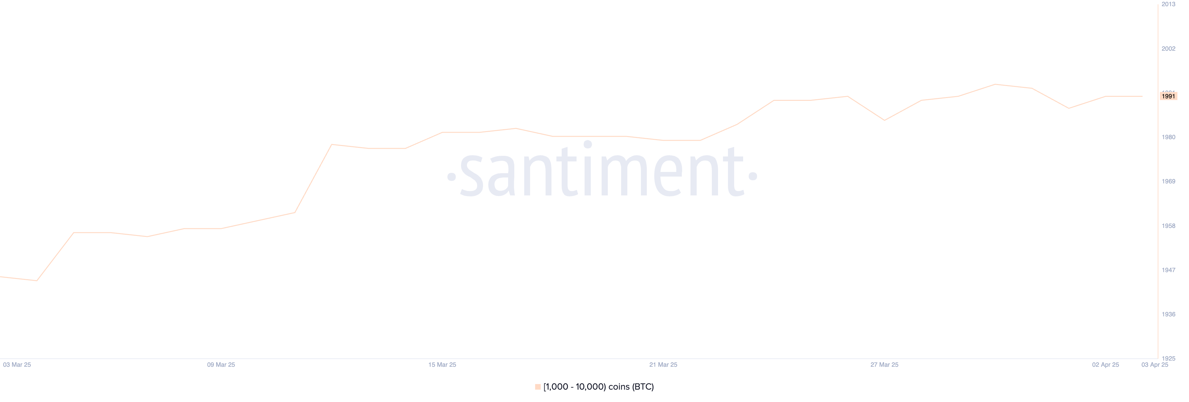 Antalet Bitcoin-valar—plånböcker som håller mellan 1 000 och 10 000 BTC—står för närvarande på 1 991, en siffra som har förblivit anmärkningsvärt stabil sedan den 24 mars.