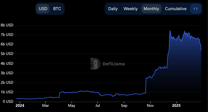 År 2024 var en avgörande period för BTCFi, med anmärkningsvärda tillväxtsiffror. Enligt DefiLlama ökade det totala värdet låst (TVL) i Bitcoin-baserade DeFi-protokoll från 307 miljoner USD i januari till över 6,5 miljarder USD den 31 december 2024, en ökning på mer än 2 000 %. Denna ökning speglar ett växande intresse och förtroende för Bitcoins DeFi-möjligheter.