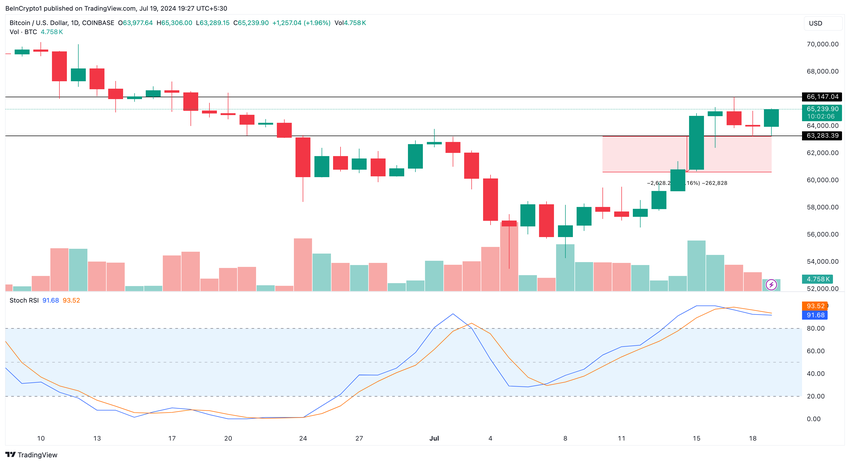 Tjurarna ser dock ut att ropa efter stöd vid 63 283 dollar. Det stokastiska RSI visar dock att stödet kanske inte håller, med tanke på att myntet är överköpt.
