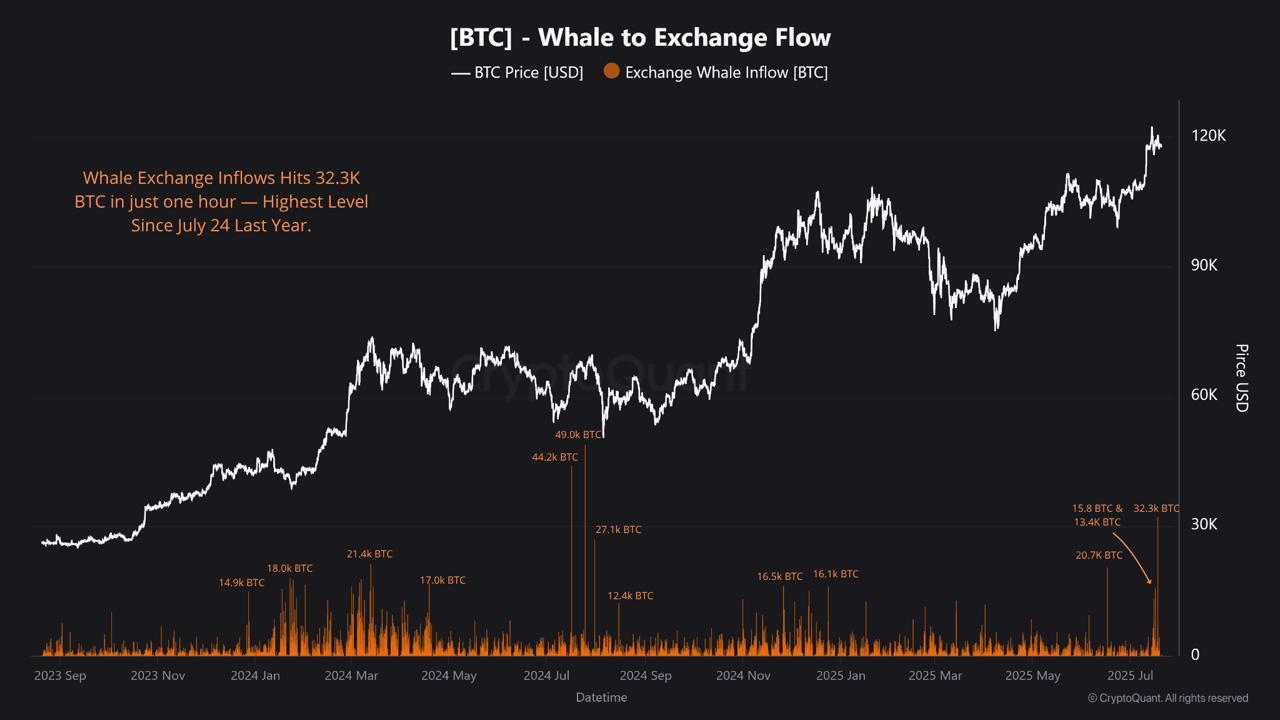 CryptoQuant-data visar att Bitcoin-valar skickade över 61 000 BTC till börser den 17 juli—den största inflödet på en dag på ett år.
