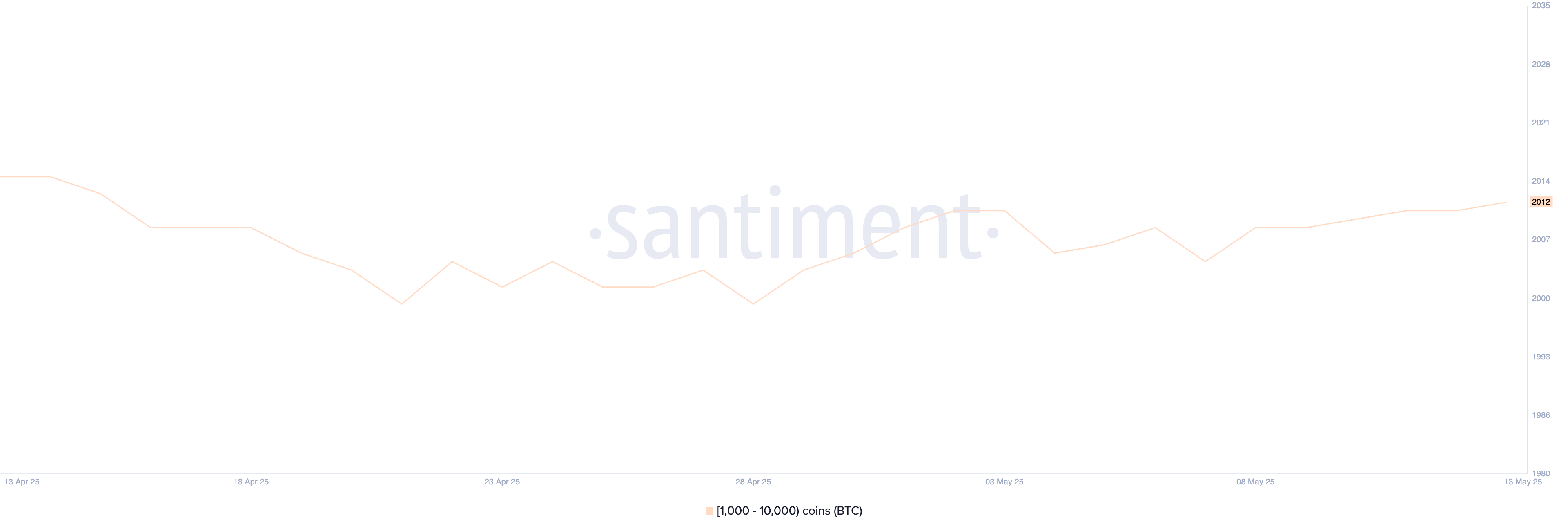 Antalet Bitcoin-valar—plånböcker som innehåller mellan 1 000 och 10 000 BTC—har ökat något, till 2 012 idag, upp från 2 009 den 9 maj.