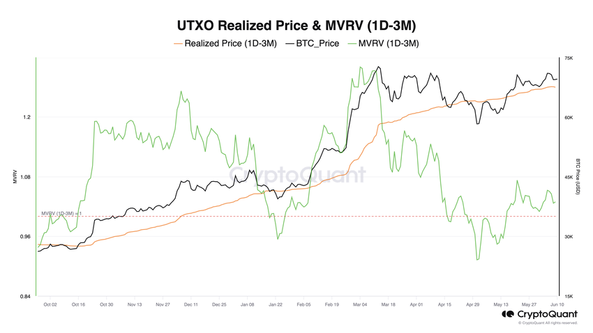 Det genomsnittliga förvärvspriset för Bitcoin som köpts mellan en dag och tre månader sedan är 67 500 dollar. Bitcoins som köpts inom denna tidsram står för 17% av det totala cirkulerande utbudet.