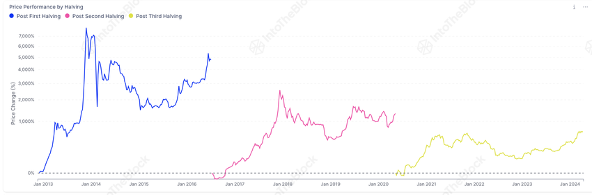 Historiskt sett har Bitcoin-halveringar förknippats med volatilitet på kort sikt men hausseartade trender på lång sikt. Vincent Maliepaard, marknadschef på IntoTheBlock, berättade för BeInCrypto att halveringarna 2016 och 2020 såg Bitcoin rusa in i händelserna, följt av en nedgång strax efter, men så småningom bröt tidigare heltidshöjder inom några månader.