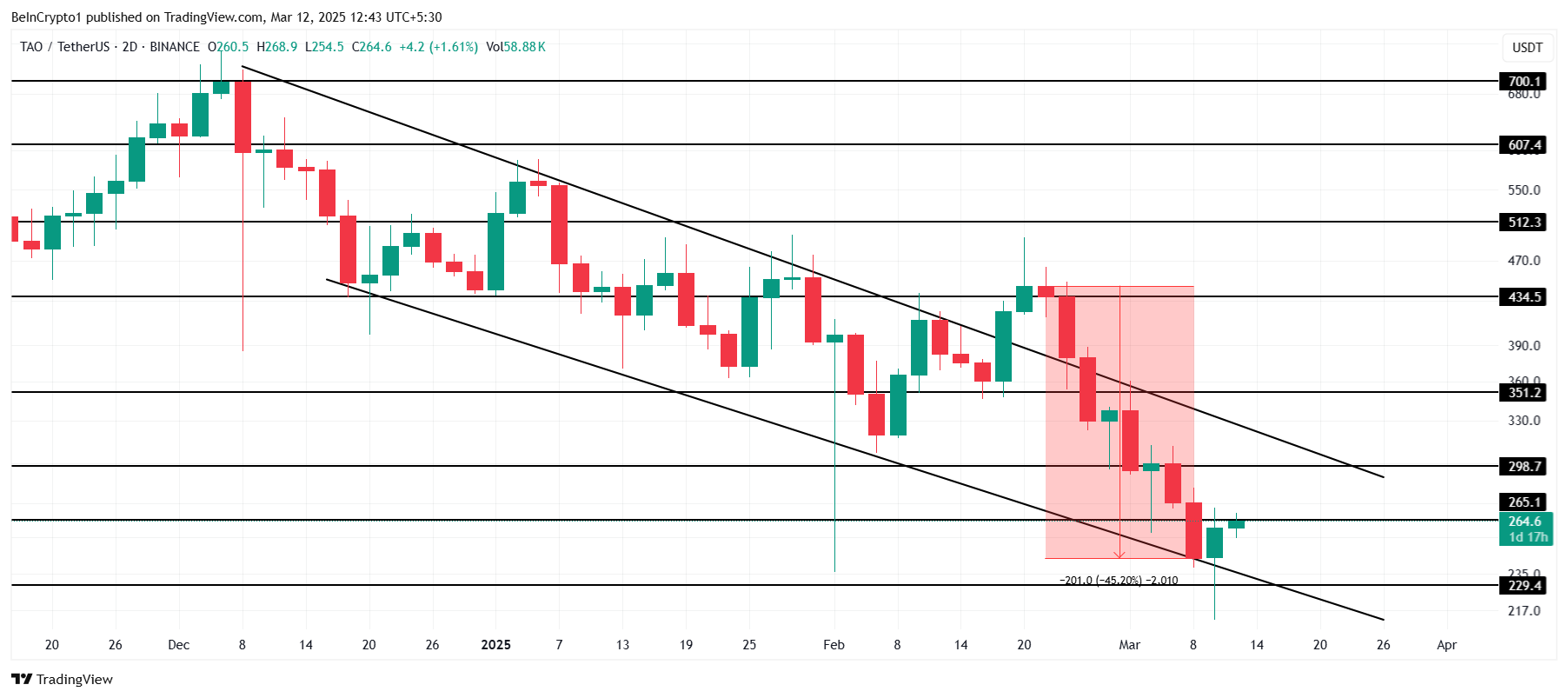 TAO upplevde nyligen en betydande nedgång på 45 % under två veckor, främst på grund av att det inte lyckades bryta ut ur det fallande kilmönstret. Men TAO handlas nu till 264 USD, efter att ha studsat från den nedre trendlinjen i detta mönster. Altcoinet är fortfarande fast under 300 USD, men det verkar redo att bryta detta motstånd inom en snar framtid.