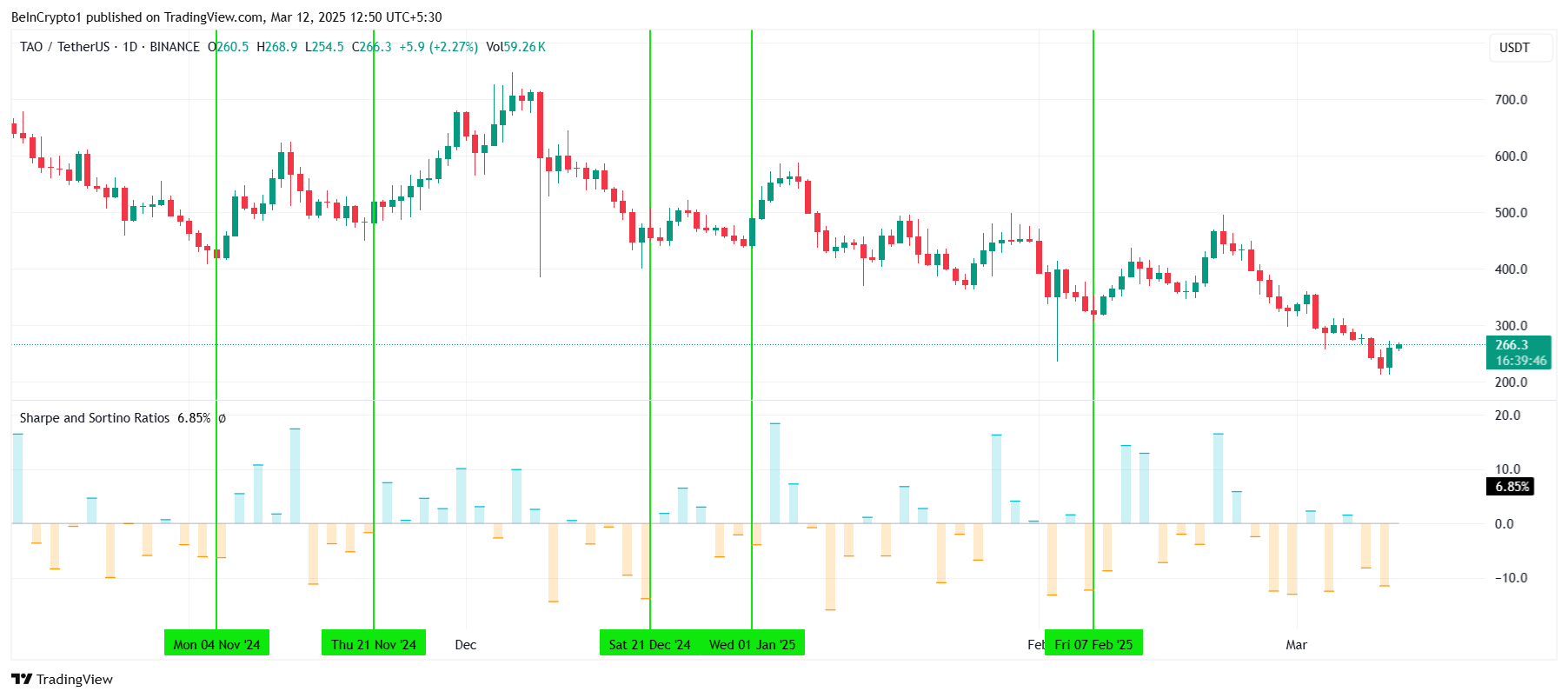 Bittensors bredare makromomentum visar också tecken på möjlig återhämtning. Sharpe-kvoten, en viktig teknisk indikator, är just nu djupt negativ, men detta har historiskt varit ett tecken på framtida prisåterhämtning. När Sharpe-kvoten nådde liknande nivåer tidigare lyckades TAO vända sin nedåtgående trend, vilket gör det till en viktig signal för framtida uppgång.