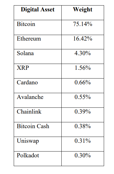 Enligt ansökan inkluderar fonden Bitcoin, Ethereum, Solana, XRP, Cardano, Avalanche, Chainlink, Bitcoin Cash, Polkadot och Uniswap. BitWise har haft denna initiala fond sedan 2018 och kopplar dess värde till de tio mest värdefulla kryptovalutorna.