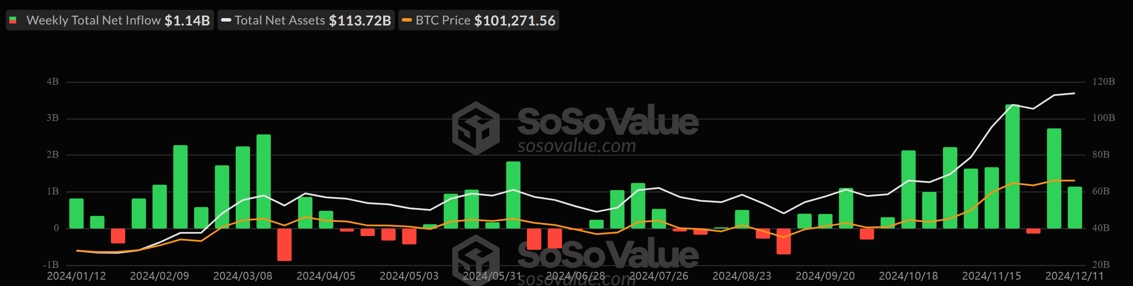 Introduktionen av amerikanska spot Bitcoin-ETFer i januari var en stor katalysator för Bitcoins senaste uppgång. Förvaltade tillgångar i dessa fonder har överstigit 113 miljarder USD, med nästan 10 miljarder USD investerade sedan Trumps valvinst i november.
