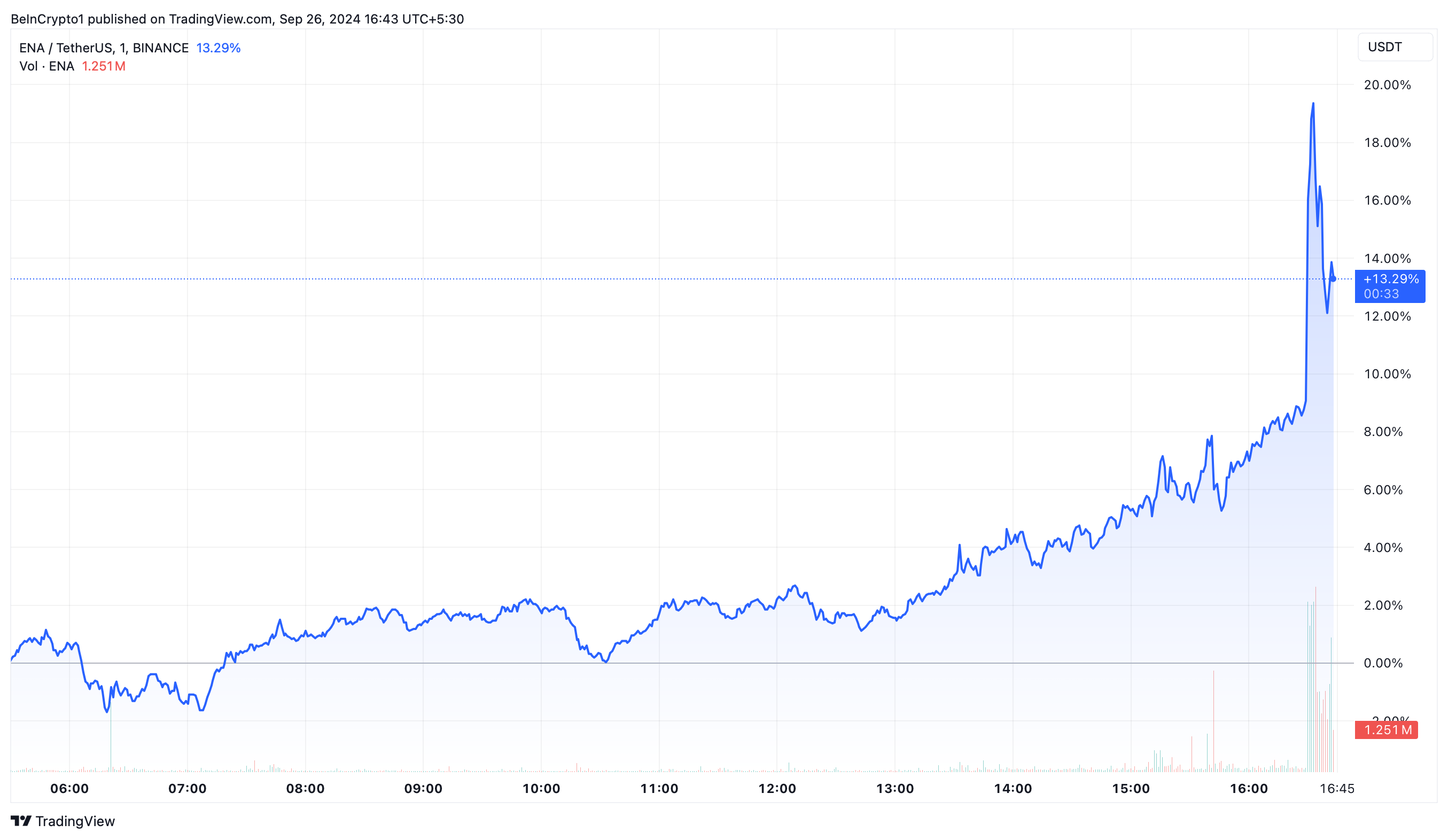 Denna innovation kommer vid en omvandlande tidpunkt för Ethena. Efter avslöjandet av stablecoin såg Ethenas inhemska token, ENA, en ökning i värde på 13,29%, vilket speglar ett positivt mottagande på marknaden.