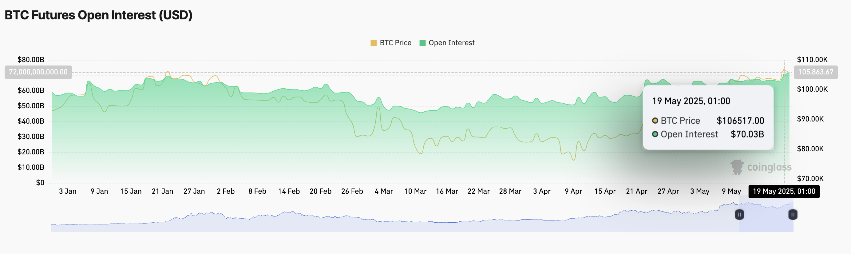 Upp 3 % det senaste dygnet, handlas BTC nu till 105 543 USD och visar en stärkt positiv trend. Detta återspeglas i dess futures öppna intresse, som har nått sin högsta nivå hittills i år. Vid pressens tidpunkt är det över 70 miljarder USD, en ökning med 1 % det senaste dygnet.