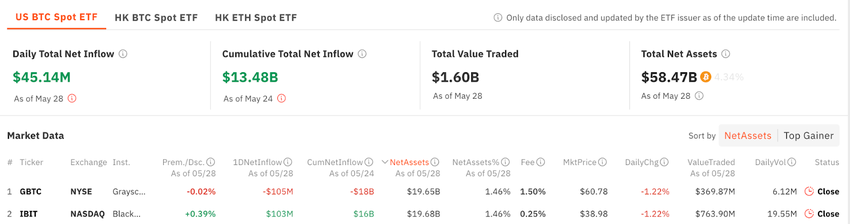 Samtidigt upplevde GBTC sitt största utflöde under en enskild dag på 18 handelsdagar, totalt 105 miljoner USD. Denna minskning står dock i kontrast till den övergripande positiva trenden i Bitcoin ETF-sektorn, som såg ett nettoinflöde på 45,14 miljoner dollar den 28 maj 2024. Detta förlänger en 11-dagars rad av nettoinflöden över 11 amerikanska Bitcoin-ETF: er.