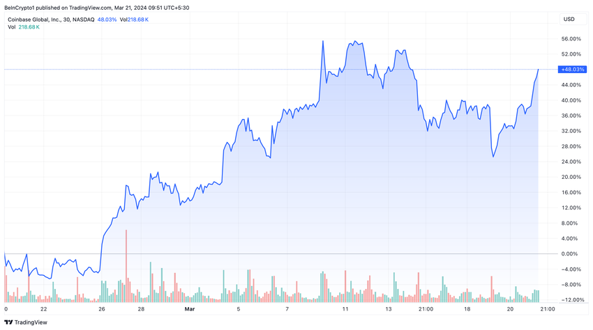 Marknaden reagerade positivt på denna satsning, med Coinbases aktie som sköt i höjden med över 10% på onsdagen. Under den senaste månaden har aktien dessutom ökat med 48%. Denna uppgång återspeglar verkligen marknadens förtroende för den strategiska alliansen mellan Coinbase och BlackRock.