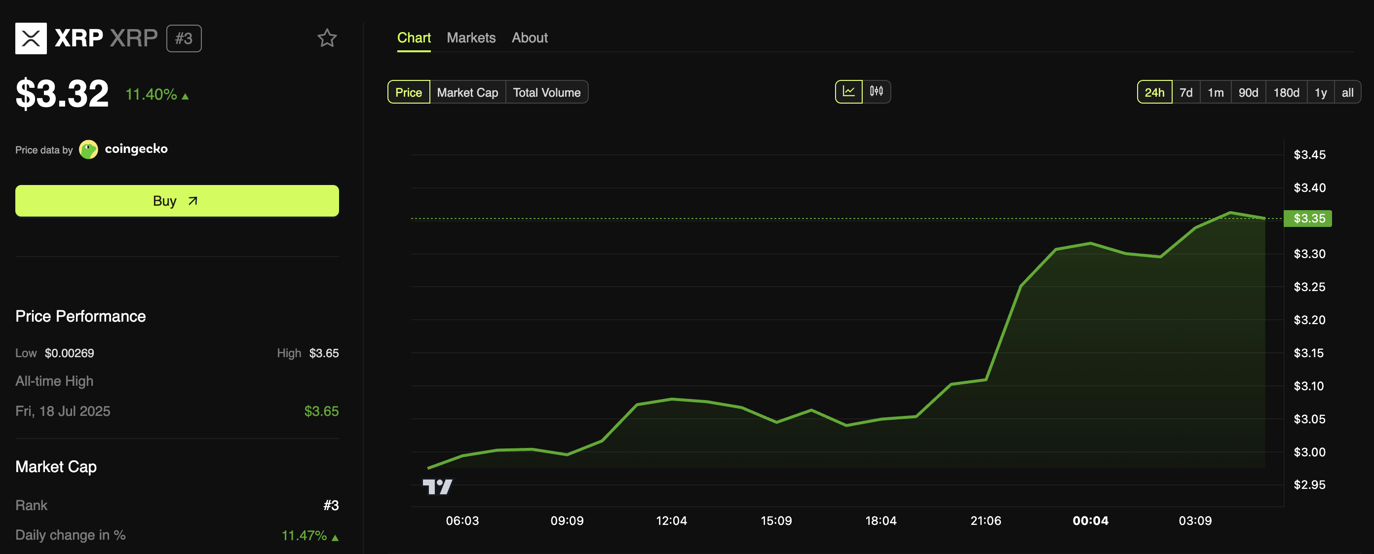 Enligt BeInCrypto Markets data stod XRP:s handelspris på 3,32 USD vid skrivande stund.